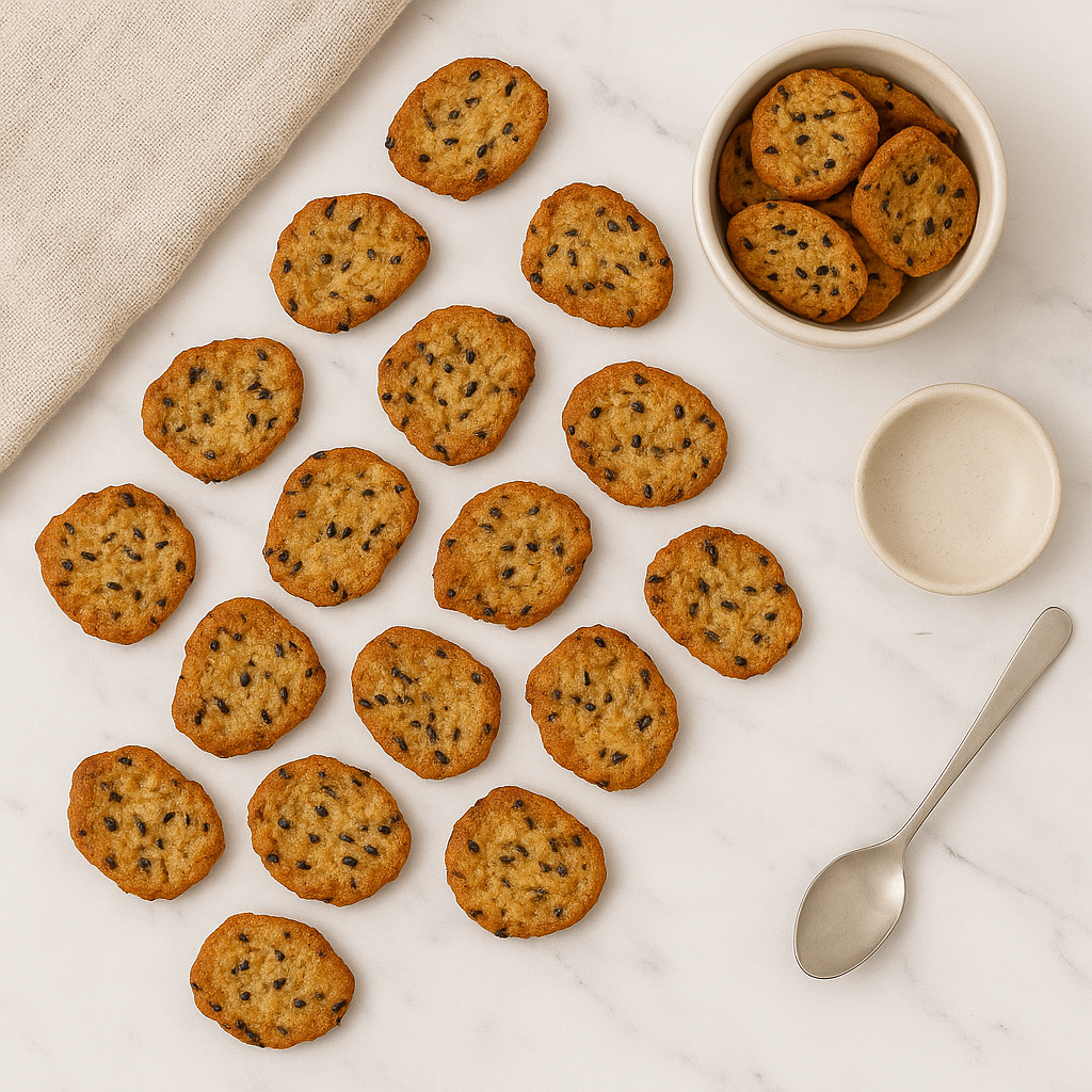Knapperige rijstcrackers met sesamzaad. Licht, bros en hartig – een ideale snack voor tussendoor of bij de borrel.